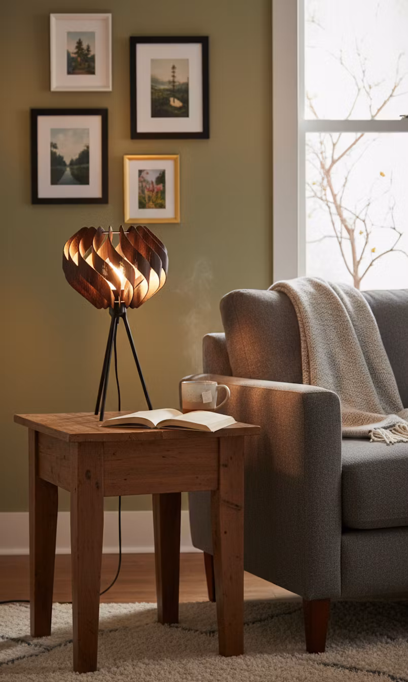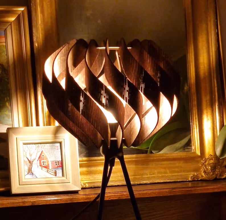 Bordslampa i mörkbetsad björk. Lampfot med tre ben. Ljuskälla E27 ingår inte.