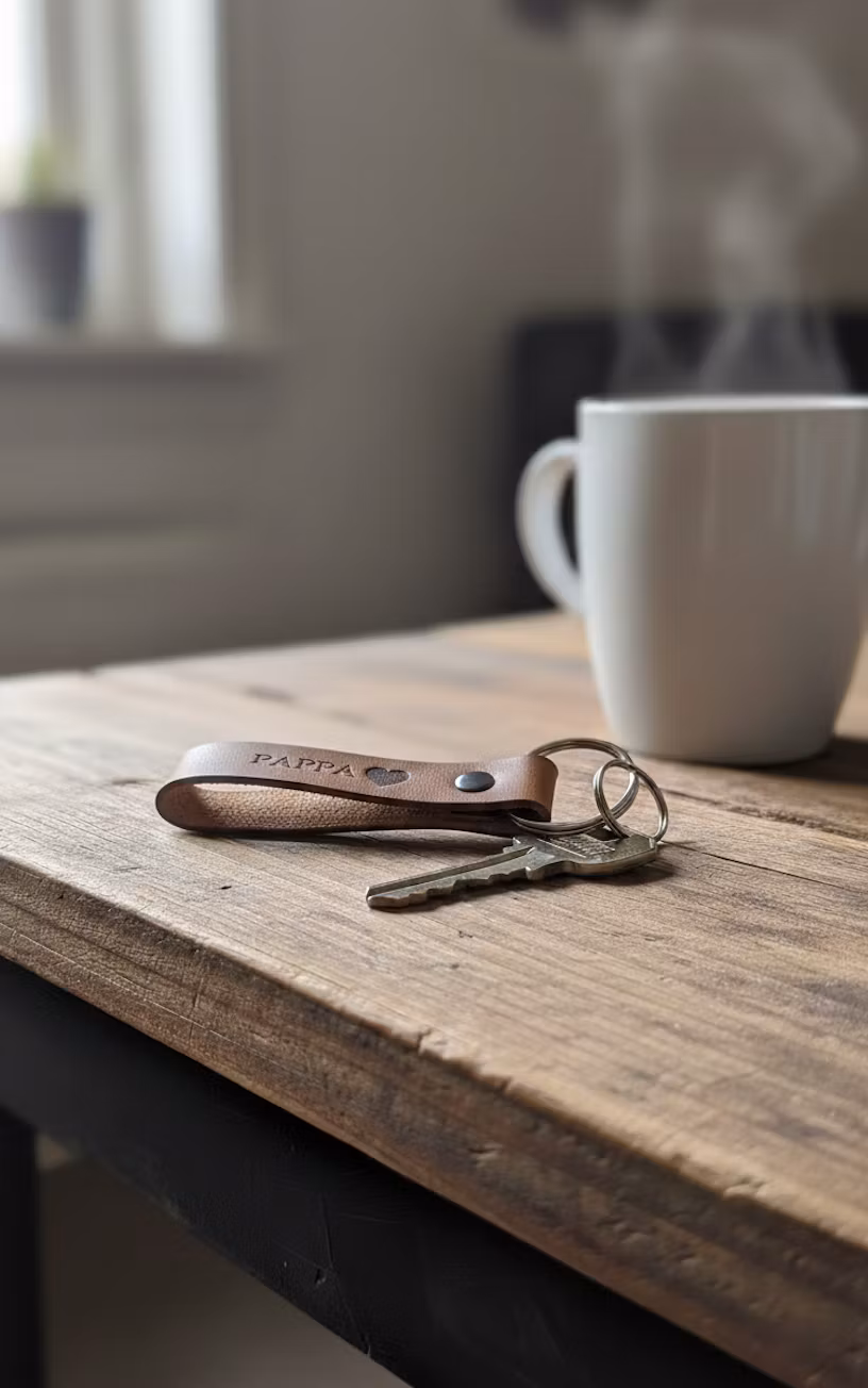 Nyckelring i vegetabiliskt garvat läder med personlig gravyr. Längd 12 cm, bredd 2 cm, diameter på nyckelring 3 cm. Välj "Eget alternativ" och fyll i fältet för