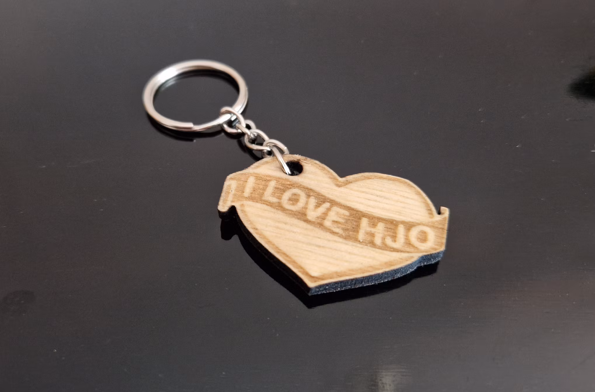 Liten nyckelring med gravyr " I love Hjo". Finns i 4 varianter, ljust trä, röd spegelakryl, guld spegelakryl eller läder. Storlek på hjärtat är ca 4,5 cm x 3 cm.