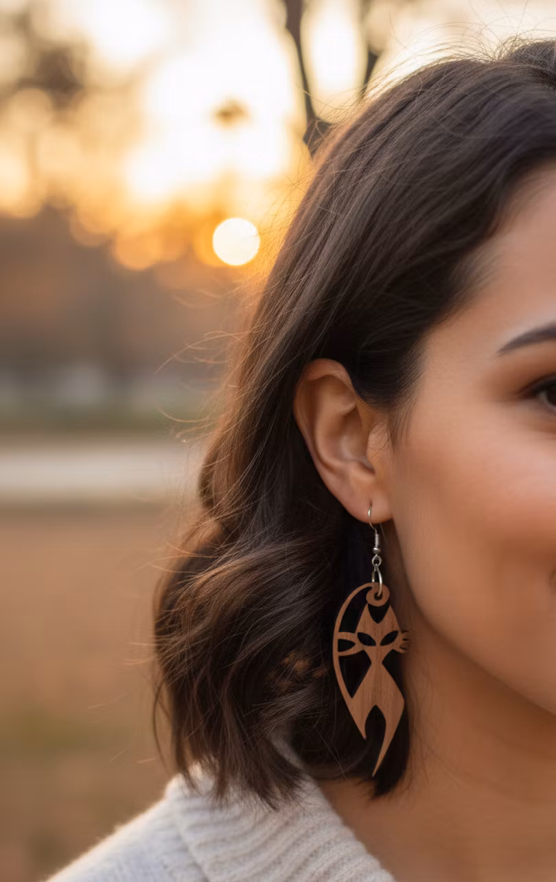 Örhänge katt. Tillverkad i tunt hyvlat rönnsbärsträ som oljats in. Hänge i 925 silver. Örhänget är 7,5 cm i sin totala längd.